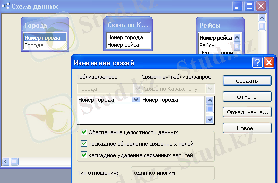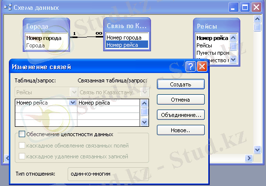 Содан кейін біздің үш кестеміз шығады. Бірінші кестедегі Номер рейса мен екінші кестедегі Номер рейса және екінші кестедегі Номер города жолдарын байланыстырғанда Изменеие связей терезесі ашылады. Осы терезеде 3 байланысын да таңдау керек. Олар: