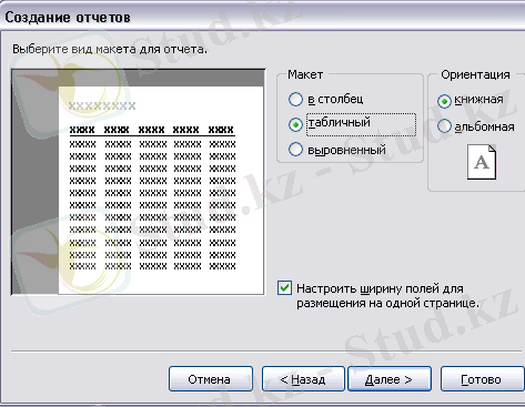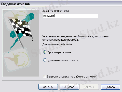 Создание отчетов терезесінде 3 түрлі макеттің біреуін таңдаңыз. Далее батырмасын басамыз. Келесі терезеде задайте имя отчета деген жерге отчеттің қалай сақтайтыныңызды жазыңыз. Готово батырмасын басыңыз(37-сурет) .