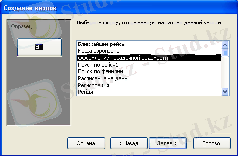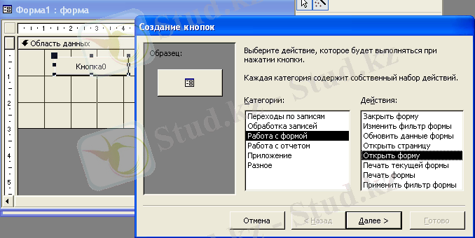Батырманы Панель элементов деген терезеден аламыз. Осы батырманы формаға орналастырғанда Создание кнопок терезесі шығады. Категории: Работа с формой-> Действия: Открыть форму->Далее қадамдарын орындаймыз(42-сурет) .