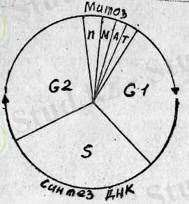 1-сурет. Митоздық циклдың схемасы: G, интерфазаның пресинтездік кезеңі, S - ДНК-нық синтсз кезеңі, G 2 - интер-фазаның постсинтездік кезеңі, П. МЛ. Т - профаза, метафаза, анафаза, телофаза (Свснсеннан, 1980) .