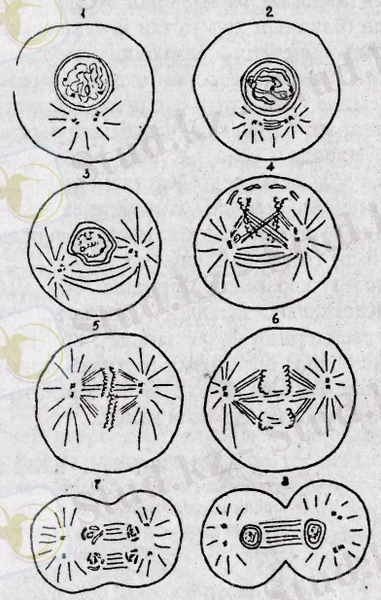 2-сурет. Митоздың схемасы: 1-2 - интерфаза, 3-4 - профаза, 5 - метафаза, 6 - анафаза, 7-8 - телафаза (Мэзия, 1962) .