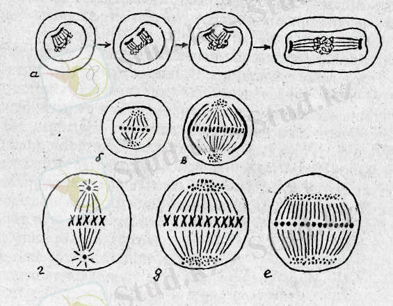 a - плевромитоз, б - жабық ортамитоз, в - жартылай жабық ортамитоз, г-е - ашық ортамитоз, г - жануарлар клеткасының митозы, д - жоғары сатыдағы өсімдіктер митозы, е - амсбаның митозы.
