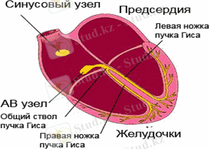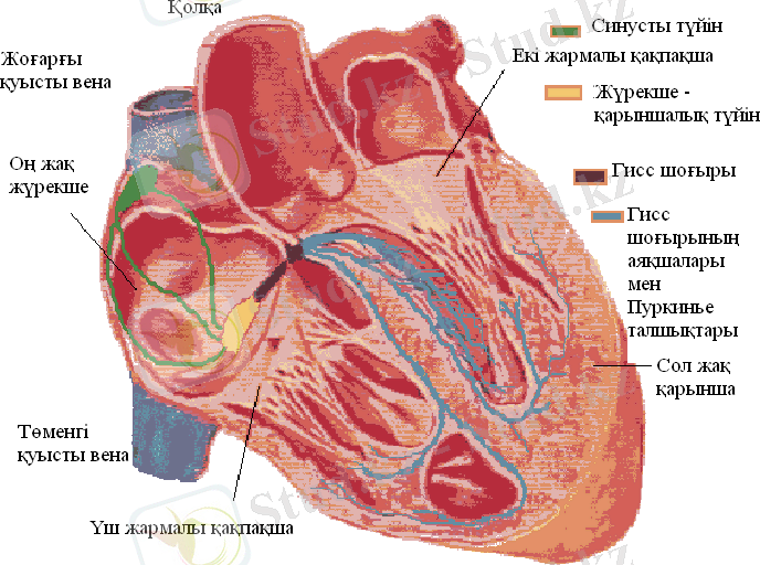 Балалардағы ерекшеліктері. Жүректің өткізгіш жүйесі синус түйініннен немесе Кисс-Фляк түйіні, атриовентрикулярлы түйіннен (Ашофф-Тавар түіні) Гис будасынан, Гис будасының тарамдарынан, Пуркинье талшықтарынан тұрады.