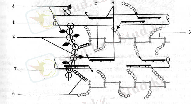 1 - целлюлоза жіпшумағы; 2 - белок; 3 - рамногалактуронан; 4 -силоглюкан; 5 - 4-байланысқан (арабино) галактан; 6 - 3-байланысқан (арабино) галактан; 7 - экстенсиндегі серин қалдықтары; 8 - экстенсин тетрарабинозиді.