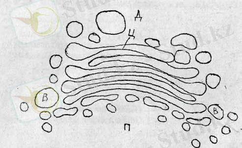 Диктиосома құрылысының схемасы. П - проксималь бөлігі, Д - дистальдік бөлігі, В -вакуольдар, Ц -жалпақ мембраналық истерналар