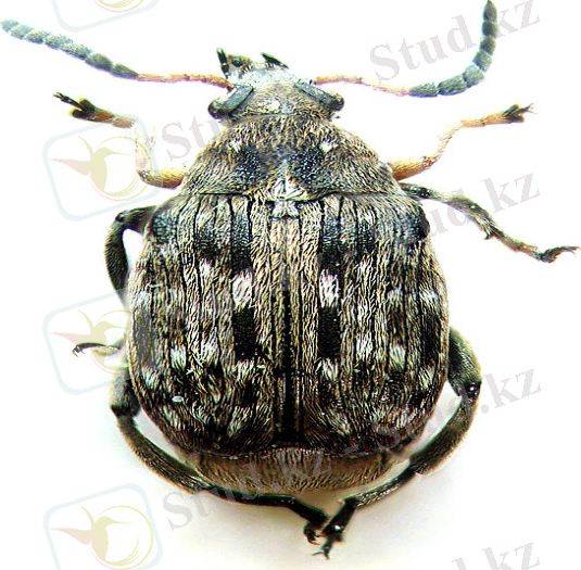 Денесін қоңыр түсті түктер басқан қара қоңыз, ұзындығы 4 - 5 мм, қанаттарының үстінде ақшыл дақтар мен жолақтар, құрсағының ұшында крест тәріздес ақ таңба бар.