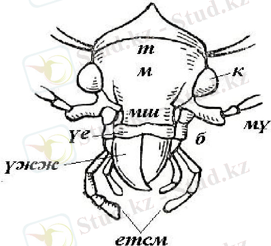 2-сурет. Қоңыздың басының құрылысы. м - маңдай, т - төбе, к - көз, мұ - мұрты, мш - маңдайша, үе - үстіңгі ерні, үжж - үстіңгі жақ сүйегі, б - беті, етсм - еріннің төменгі сезгіш мұртшасы.