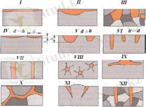 1-сурет. Коррозиялық бұзылу сипаты: біртегіс - І; біртегіс емес - ІІ; жинақты - III; дақты - IV; жаралы - V; питтингілі - VI; тесікті - VII; жіп тəрізді - VIII; беткі қабаттың астындағы - ІX; кристаларалық - X; үшкір - ХI; жарылысты -XII; d жəне h - коррозиялық бұзылыстың диаметрі мен тереңдігі