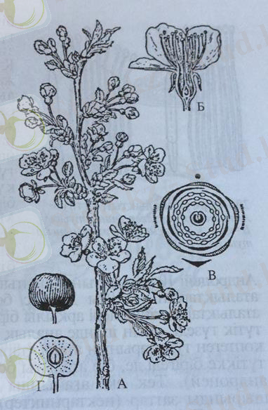 А- гүлдеп жеміс беретін өркен; Б-гүл (тікесінен жасалған кесіндісі) ; В- гүлдің диаграммасы; Г-жеміс (сыртқы көрінісі және тікесінен жасалған кесіндісі) .