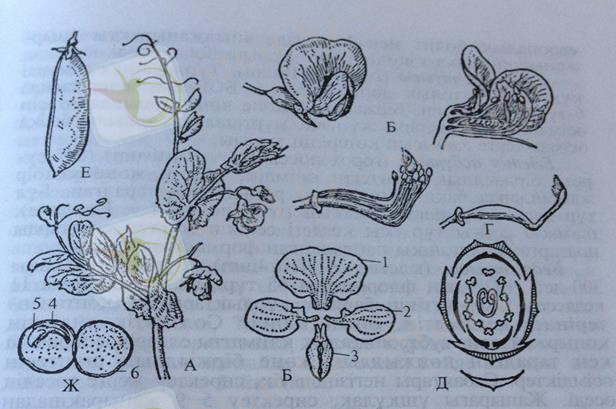 А-репродуктивтік өркен; Б-гүл (жалпақ көрінісі, тікесінен жасалған кесіндісі, гүл серігі жоқ) ; В- күлте жапырақша; Г-гинецей; Д-гүлдің диаграммасы ; Е-жемісі бұршақбас (боб) ; Ж-тұқым (жарып қарағандағы көрінісі) : 1-желкен ; 2-ескекше; 3-қайықша; 4-тамырша; 5-бүршікше ; 6-тұқым жарнағы.