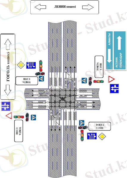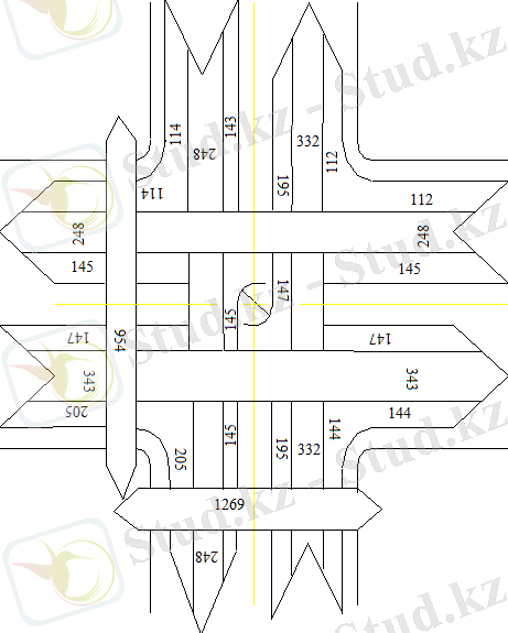 - берілген жол қиылысындағы көлік және жаяу жүргіншілер ағындары-ның қозғалыс қарқындылықтарының картограммасы (1. 2-сурет) салынады.