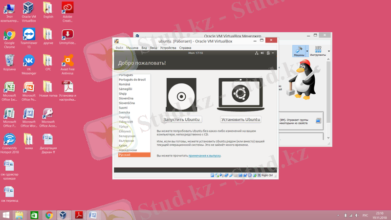 Қысқа уақытша үзілістен кейін экранда виртуалды машинаның жұмыс үстелінің суреті пайда болады (сур. 1. 11) . Тінтуірдің сол жағында тізімде тіл таңдау керек (орыс тілінде) және Ubuntu орнату түймешігін басыңыз. Орнату процесі басталады (сур. 1. 12) .