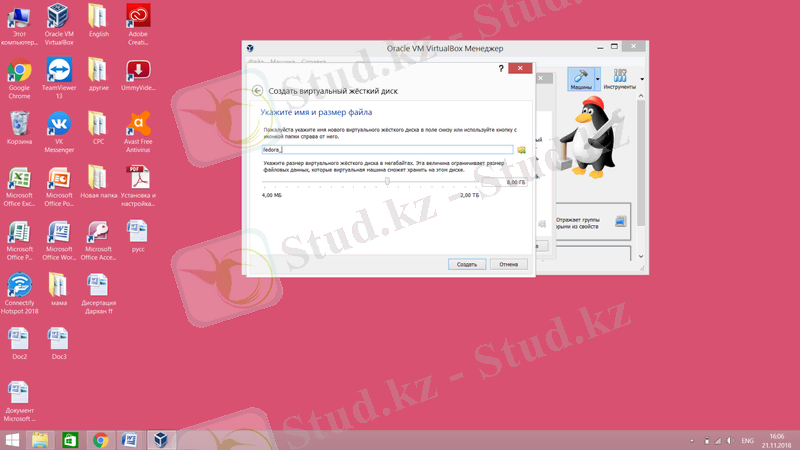 Fedora атауын және виртуалды жабайы табиғаттың ең үлкен өлшемін көрсетіңіз: 12 ГБ. Жасау түймешігін басыңыз (сур. 2. 8) .