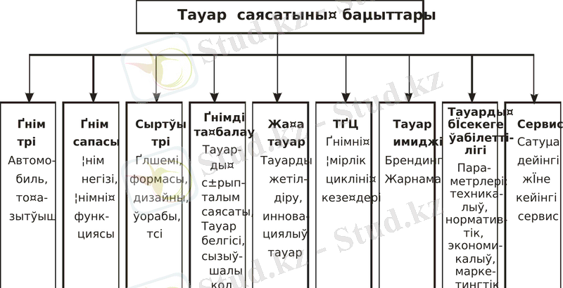 Тауар саясаты дегеніміз - тауар ассортиментiн қалыптастыру бойынша олардың жаңа түрлерiн жасау, сапа және бәсекеге қабiлеттiлiгiн жоғарылату, өмiрлiк циклiн талдау, тауарлық белгiлердi пайдалану, буып-түю, орау, таңбалау және сервистiк қызмет көрсету бойынша шешiм қабылдауды қажет ететiн фирманың көп факторлы қызмет көрсету аумағы (18-сурет) .