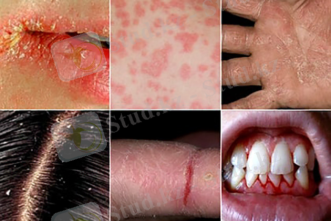 Ерін, мұрын, құлақ, тырнақ цианозы, қызыл иектің кебірсуі мен көгеруі, тіс аралық емізікшелердің ісінуі, ерінмен басқанда және тіс шайғанда қызыл иектің қанаққыштығы, терінің бозғылт және құрғақтығы, гипотермия, бірлі - жарымды петехиямен шаш фолликулаларының мүйізденуі.