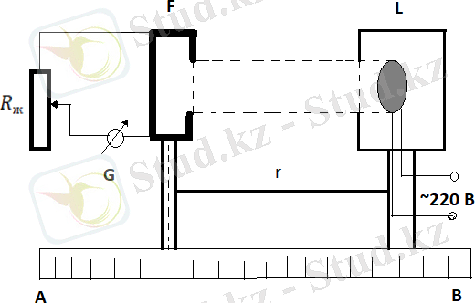 Бұл жұмыста: жылжығыш (ползунок) және миллиметрлік шкаласы бар оптикалық сәкі, жарық көзі - 40 Вт-қа есептелінген қыздыру шамы, 220 В, күн батареясы, фототокты өлшеуге арналған 3 мА-ге есептелген гальванометр, реостат қолданылады.