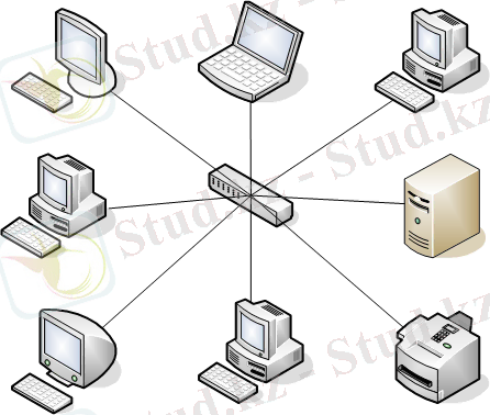 Жұлдыз тәрізді топология. Мұнда ортақтандырылған коммутациялық түйін - желілік сервер болуы тиіс, ол барлық мәліметтерді жеткізуді жүзеге асырады (Сурет 2. ) . Бұл топологияның артықшылығы - кез келген бір жұмыс станциясының істен шығуы жалпы байланысқа әсер етпейді.