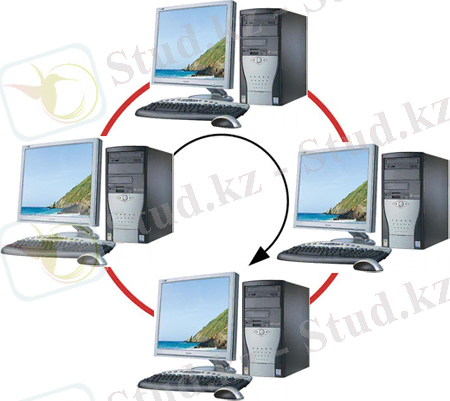 Сақиналық топология. Мұндай байланысу арналары тұйықталған сақина бойында орналасады. Жөнелтілген мәлімет біртіндеп барлық жұмыс станцияларын аралап шығады да, оны керекті компьютер қабылдаған соң жұмыс тоқтатылады (Сурет 3. ) . Бұл топологияның кемшілігі кез келген бір жұмыс станциясының істен шығу жалпы байланыста бұзады.