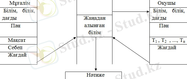 Бұл айтылғандарды сызба түрінде көрсетуге (сурет 1) және төмендегіше түсіндіруге болады: тәжірибелі, білімді, қабілетті өз дағдысы мен білігі бар мұғалім, оқу материалдарына сай, қажетті жағдайды, дәлелді келтіріп, мақсатты айқындай отырып, оқушыға танымдық тапсырма береді, ал ол өз кезегінде білімі, тәжірибесі біліктілігіне сүйеніп, қажетті нәтижеге жетуі үшін бірқатар іс-әрекеттерді орындайды. Мұндай іс-әрекеттердің қорытындысы жаңадан алынған білім, білік, жағдай мен нәтижені, жасалынуы тиіс іс-әрекеттерді меңгеруі болып табылады. [6]