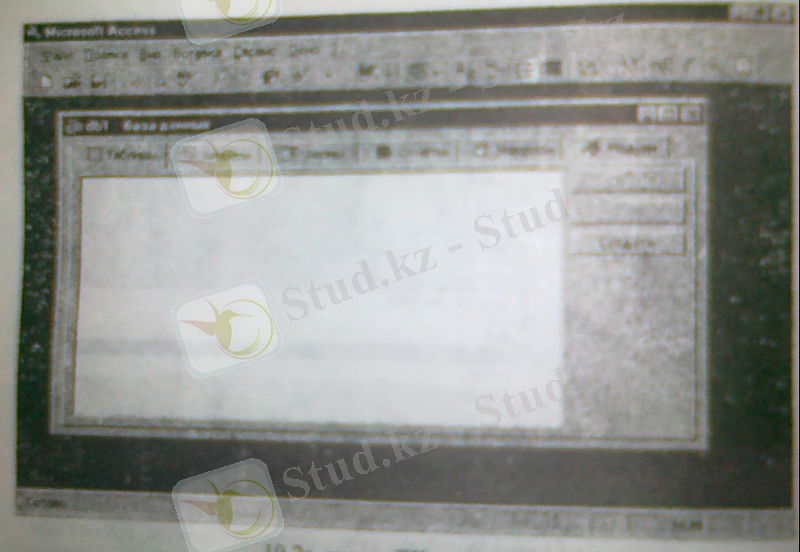 Оның астынғы жағында Access-тің көмескі түрде өз терезесі байқалады. Access-тің негізгі мәзірпунктеріне енгізілген командалардың көпшілігі Windows командалары сияқты. Қажет болса, олардың қызметін Access-тің анықтамалық мәзірі арқылы анықтау қиын емес. Access 97-де 22 түрлі аспаптар панелі бар. Олардың бірін экранға шығару не жасыру үшін Түр→Аспаптар панелі→Бапқа келтіру командасын беріп, көрінген сұхбаттық терезеден сәйкес ауыстырып қосқышты орнату не алып тастау жеткілікті. Қор терезесінде деректер қоры құрамындағы алты объектімен жұмысты бастауға арналған алты қондырма бет бар: Кестелер, Сұраныстар, Формалар, Есептер, Макростар, Модульдер. Олардың алғашқы төртеуі негізгі объектілер(2 сурет) .