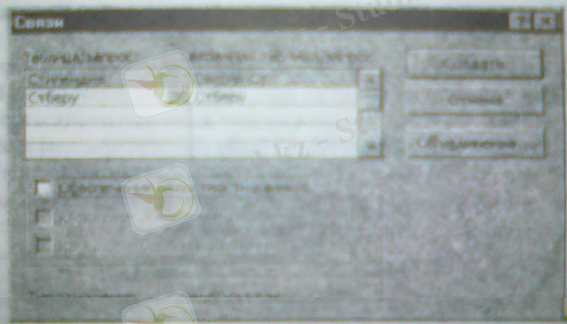 6. Терезенің "Берілгендер тұтастығын қамтамасыз ету" ауыстырып қосқышын орнатып, " Біріктіру " түймесін шерту. " Біріктіру параметрлері " сұхбаттық терезесі көрінеді. 7. Терезеде " Стипендияның барлық жазбалары мен Сессия_Ст-ның байланыстырылған өрістері бірдей жазбаларын біріктіру " ауыстырып қосқышын орнатып, ОК түймесін шерту. " Байланыстар " терзесі қайта көоінеді. 8. оның Құру түймесін шерту. Кестелер сызық арқылы " Стберу" өрістері бойынша байланыстырылып қойылады(9 сурет) .