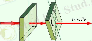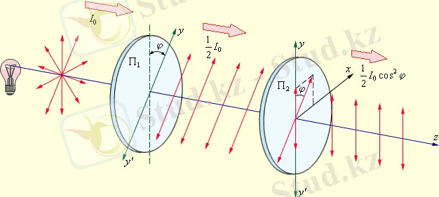 Табиғи жарықтың екі идеал П 1 жəне П 2 поляроидтардан өтуін қарастырайқ (5 сурет) . Олардың рұқсат етілген бағыттары бір бірімен ϕ бұрыш жасайды. Бірінші поляроид поляризатор ролін атқарады, ол табиғи жарықты жарыққа айналдырады. Екінші поляроид өзіне түскен жарықты талдайды (анализ жасайды), сондықтан анализатор деп аталады.