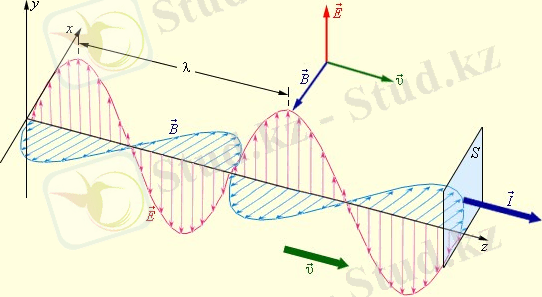 Электромагниттік толқында Ē мен В векторлары бір біріне перпендикуляр болады жəне толқынның таралу бағытына перпендикуляр жазықтықта жатады. (3 сурет) .