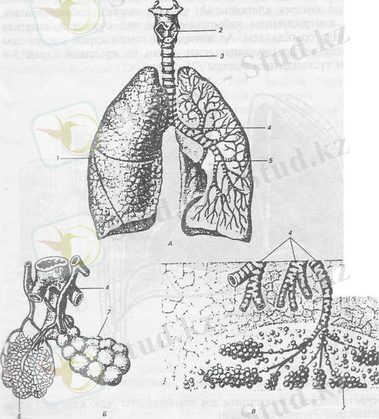 А-ауа өтетін жлдар және өкпе; Б-өкпе альвеолдары және олардың қанмен жабдықталуы; В-өкпе бөлігі; 1-өкае, 2-көмекей, 3-кеңірдек, 4-бронхылар, 5-ақ бронхылар, 6-капиллярлық тор, 7-альвеолдар.