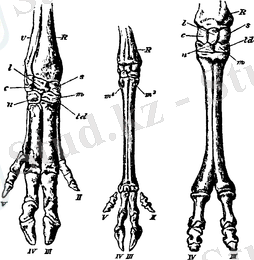 Кейбір жұптұяқтылардың алдыңғы оң сирағының сүйектері. Солдан оң жаққа қарай: доңыз (Жабайы шошқа), марал (Cervus elaphus), түйе (Camelus bactrianus) .