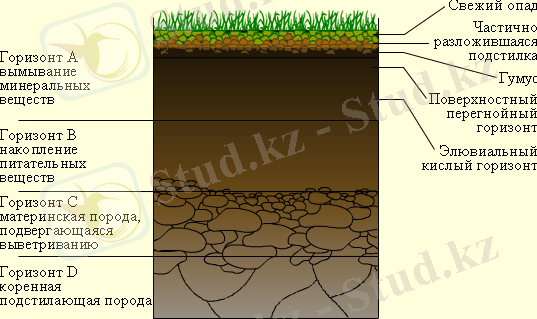 А - Оргонегендік қабат, жерге түскен жапырақтардың органикалық қалдықтарынан және өлі өсімдіктердің сабақтану байламынан құралған. Тың жерлерде болады.