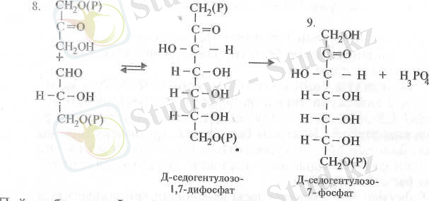 Пайда болған эритрозо-4-фосфат ре-акцияласып седогептулозо-1, 7-дифосфатқа айналады (8) . Бұл реакцияға ферменті қатысады.