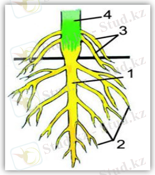 - Негізгі тамыр. 2. Жанама тамыр. 3. Қосалқы тамыр. 4. Сабақ.