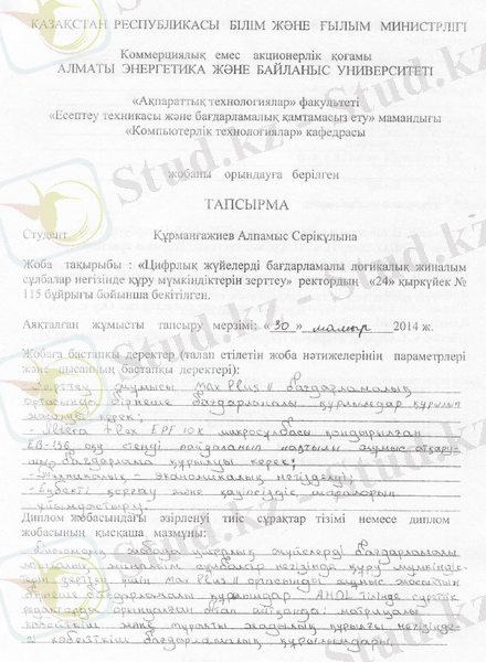 зерттеуде MAX PLUS ІІ бағдарламалық ортасы пайдаланылады. Жобаны