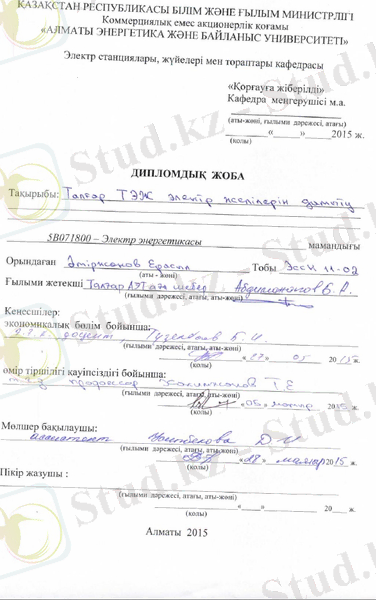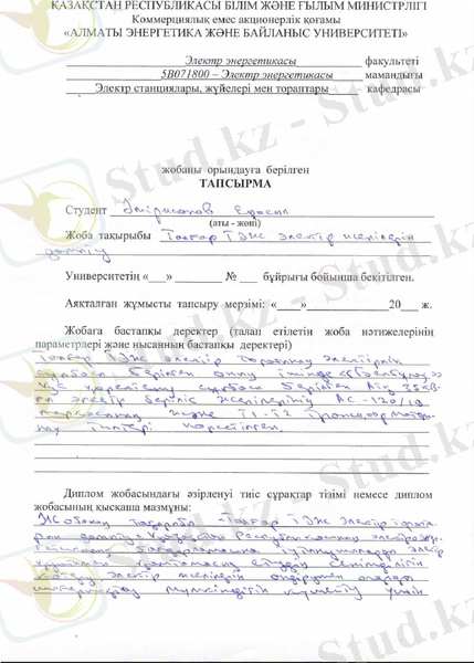 Бұл дипломдық жобаның тақырыбы «Талғар ТЭЖ электр тораптарын