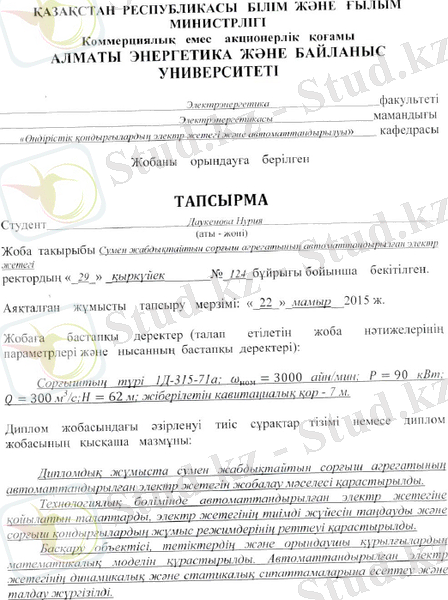Дипломдық жұмыста сумен жабдықтайтын сорғыш агрегатының