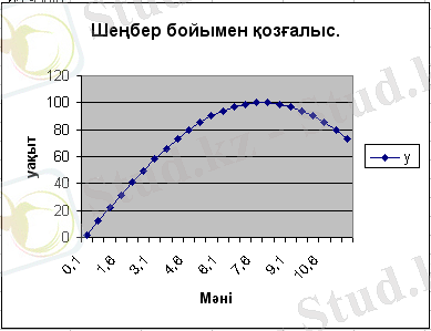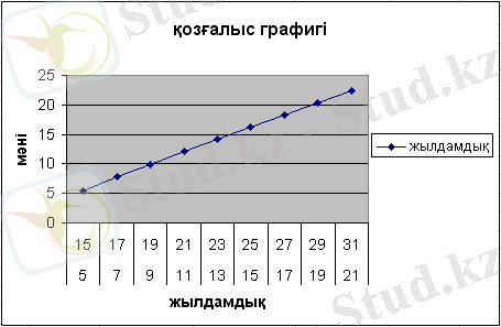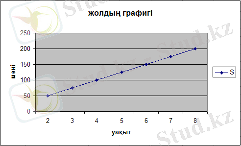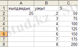 1 этап. Мәндерді енгізу. Жылдамдық графигін салудан бұрын, Excel-де таблица құру керек. Жылдамдық пен уақыттың мәндерін енгіземіз. Ол үшін А1 ұяшығына жылдамдық сөзін, В1 ұяшығына уақыт сөзін, С1 ұяшығына жол сөзін енгіземіз. Енді мәндерді енгізуді бастайық. А2 ұяшығына жылдамдықтың тұрақты мәнін енгізейік, яғни 25 м/с. В2 ұяшығына уақыттың бастапқы мәнін енгіземіз, яғни 2с. В3 ұяшығына 1 қадам қосып, мәнін жазамыз, яғни 3с. Осы В2 мен В3 ұяшықтарын белгілеп, тышқанның көмегімен сол жақтағы төменгі бұрыш арқылы В8 ұяшығына дейін созып апарамыз. С2 ұшығында жолдың формуласын пайдаланып, шамалардың мәндерін орындарына қойып, есептейміз. Осы жолды С3-тен С8-ге дейінгі ұяшықтарға пайдаланамыз. Нәтижесінде мынадай таблица шығу керек (1-сурет) .