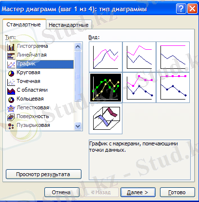 Ол стандартная құралдар панелінде Мастер диаграмм батырмасын шерту керек . Шыққан Мастер диаграмм (шаг 1из 4) : тип диаграммы терезесінде диаграмма типін таңдау керек. Мастер диаграмм (шаг 1из 4) : тип диаграммы терезесінің сол жағында диаграммалар тізімі берілген, осы тізімнен керекті диаграмма типін таңдаймыз. Біздің қарастырып отырған есебімізде, біз График типін соның ішіндегі График с маркером түрін таңдаймыз. Содан кейін Далее батырмасын шертеміз (2-сурет) .