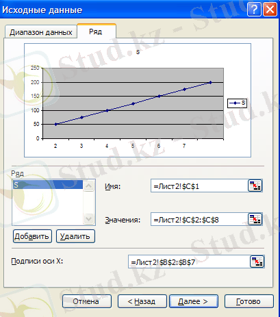 4этап. X өсі бойындағы жазуларды енгізу. Мастер диаграмм (шаг 2 из 4) : источник данных диаграммы терезесінде Ряды вкладкасын таңдап (тышқанның батырмасын шерту арқылы ), подписи оси X жолына тышқанның көмегімен В2 ұяшығына апарып В8-ші ұяшыққа дейін созып, белгілейміз. Сол кезде мынадай жазу шығуы тиіс: =Лист1!$А$2:$В$10. . Содан кейін Далее батырмасын шертеміз.