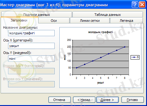5 этап. Диаграмманың тақырыбын енгізу. Мастер диаграмм (шаг 3 из 4) :параметры диаграммы үшінші терезесінде диаграмманың тақырыбын және осьтерінің атын енгізу керек. Бұл үшін Заголовки вкладкасын таңдап, тышқан батырмасымен шерту керек. Содан кейін Название диаграммы жұмыс жолына қозғалыс графигі сөзін енгізу керек. Ал Ось X жұмыс жолына Мәні сөзін және Ось Y жұмыс жолына жылдамдық сөзін енгізіп, Далее батырмасын шертеміз.