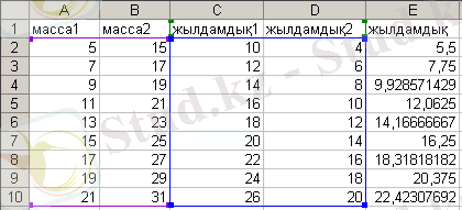 сөзін енгіземіз. Енді мәндерді енгізуді бастайық. А2 ұяшығына массаның бірінші мәнін 0, 1кг енгіземіз, А3 ұяшығына 1 қадам қосып, енгіземіз, яғни 0, 2 кг. Осы А2 мен А3 ұяшықтарын белгілеп, тышқанның көмегімен сол жақтағы төменгі бұрыш арқылы А11 ұяшығына дейін созып апарамыз. Басқа бос ұяшықтарна қатандық коэффициенті мен