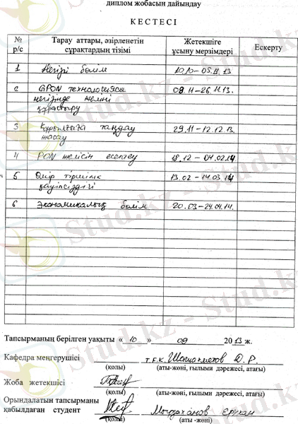 Махамбет маңындағы ҚТЖ-ны GPON технологиясы арқылы жаңарту және дамыту: желіні жобалау, есептеу және экономикалық талдау