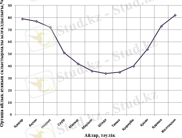 Сурет 1. 3 «Қарғалы» жеке шаруашылығының орташа айлық ауаның салыстырмалы ылғалдылығы, %