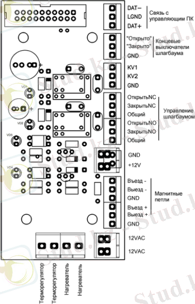 Бұйымның басқару контроллеріне электронды компоненттер койылған және кірістірілген микропрограмма көмегімен жұмыс істейді, сонымен қатар басу платасында орналасқан микропрограмма кодын кайта жаңартуға мүмкіндігі бар микропроцессорлық жабдық. Бұйым барлық орындаушы және бақылаушы компонеттері берілген алгоритімдер бойынша басқару контроллерінің микропрограммасымен құрылатын командалар арқылы жұмыс істейді. Басқару контроллерінің барлық сымдары арнайы кросс - платалаларға қосылған, осыған орай бұл бізге қолдану барысында бұзылулар болып жатса дер кезінде ауыстыруға мүмкіндік беріп отырады (4 суретке қараңыз) . Жабдықтарды сырттан қосу, кіріс және шығыс функционалды тағайындалуы бойынша тіркеуіш клемиктердің көмегімен жүзеге асырылады. Крос - платада кіріс және шығыс жұмыстарын бейнелейтін төрт жарық диоды VD1 - VD4 орналасқан. VD1 - шлагбауымды ашуға бұйрық; VD2 - шлагбаумды жабуға буйрық; VD3 - кіру панелінен келетін сигнал; VD4 - шығу панелінен келетін сигнал (4 суретке қараңыз) .