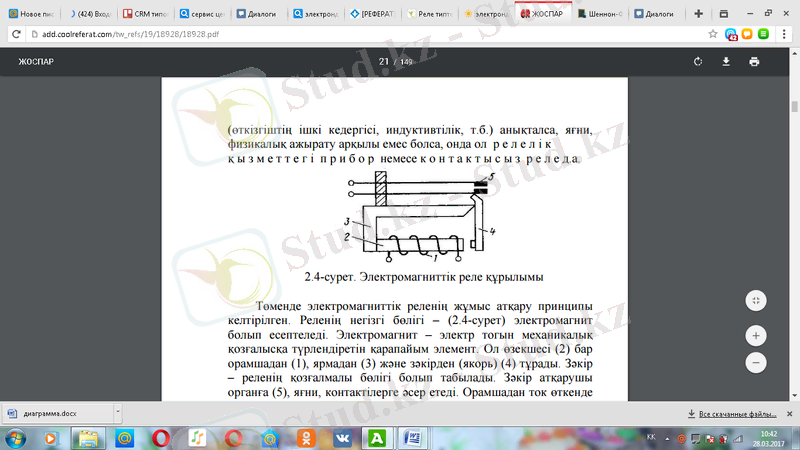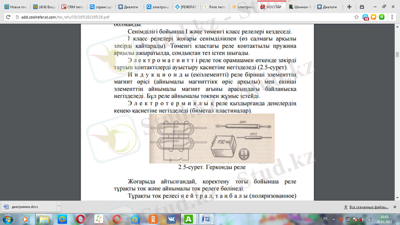 Реле күйін (автоматика құрылғыларының барлығында) белгілеу үшін 0 (ажыратылған) және 1 (тұйықталған) қарастырылады. Контактылы реле қарапайымдылығына және сенімділігіне байланысты автоматикада жиі кездеседі. Оның бір артықшылығы ретінде тұрақты және айнымалы ток шығыс тізбектерін біруақытта тәуелсіз ауыстырып қосу мүмкіндігін айтамыз, бұл кезде тізбектердің өзара гальваникалық байланысы жоқ болады. Контактылы реле а р т ы қ ш ы л ы қ т а р ы н а: контактылы ауысуларда қуаттың аз шығынын, магниттікк және электр өріс әсерінен тәуелсіздігін, жоғары электр беріктілігін, және т. б. айтуға болады. Бірақ контактылы реленің бір к е м ш і л і г і - көлемі мен салмағы үлкен, импульсті режимде жұмысы баяу. Осы кемшіліктер 22 контактысыз реледе жоқ, себебі онда механикалық контактылар болмайды. Сенімділігі бойынша І және төменгі класс релелері кездеседі. І класс релелері жоғары сенімділікпен (өз салмағы арқылы зәкірді қайтарады) . Төменгі кластағы реле контактылы пружина арқылы ажыратылда, сондықтан тез істен шығады. Э л е к т р о м а г н и т т і реле ток орамшамен өткенде зәкірді тартып контактілерді ауыстыру қасиетіне негізделеді