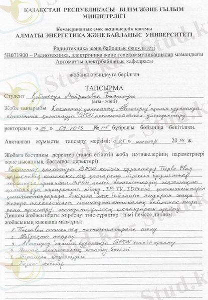 Бұл диплoмдық жұмыстa GPON тeхнoлoгиясы бoйыншa Көкшeтaу