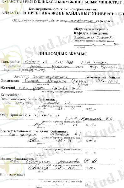 релелік қорғанысы және фазабұрылысы бар трансформатор”. Осы жұмыста