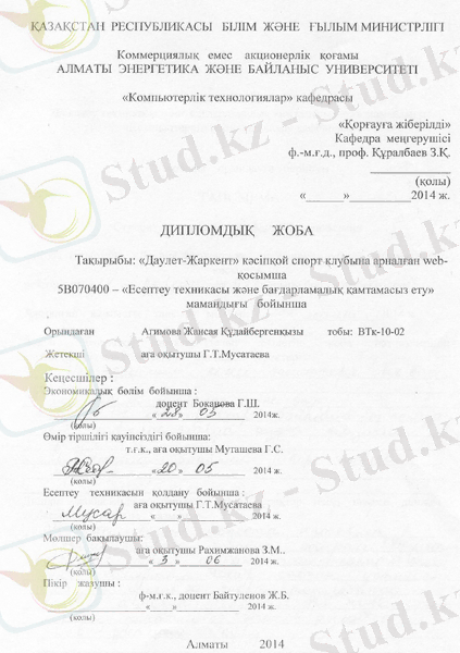 Даулет - Жаркент кәсіпқой спорт клубына арналған веб-қосымшаны жобалау және іске асыру: технико-экономикалық негіздемесі және тіршілік қауіпсіздігі бойынша талдау