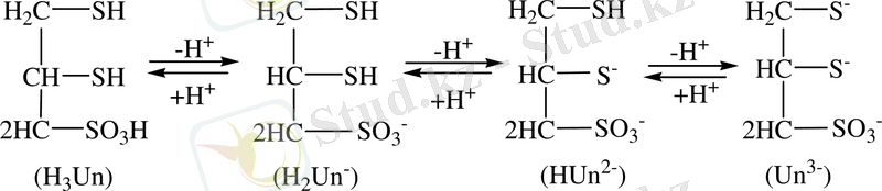 Сулы ерітіндіде унитиол әлсіз екі негізді қышқылдық қасиет көрсетеді (рН=5) күшті қышқылыды ортада (рН=1) 2, 3 - қышқыл түрінде болады