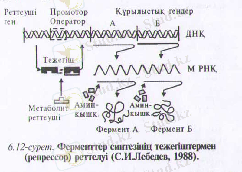 Француз ғалымдары генетик Ф. Жакоб және биохимик Ж-Моно теориясына сәйкес әлде бір ферменттің синтезделуін қоздыратын, немесе тежейтін қосындылар құрылыстық гендерге екі еселенген генетикалық. өзгеру арқылы әсер етеді. Құрылыстық гендер белоктардың молекулалық құрайтын анықтайды. Полинуклеопитті тізбекте құрылыстық гендер тобымен қатар ген - жұмысшы (ген-оператор) немесе оперон деп аталатып генетикалық реттеу бірлігі де орналасады. Оперон - қызметтері жағынан өзара байланысты ферменттер тобының синтезделуін анықтайтын гендер тобы. Оперон белгілі ферменттердің синтезделуіне қажетті құрылыстық гендердің қызметін қадағалап реттейді. Ген-оператор жайындағы промотормен ДНҚ тәуелді РНК, - полимераза ферменті байланысады. Ол А және Б ферменттер синтезін кодтейтін матрица - РНҚ-ны синтездейді. Ген-оператор қызметі өз кезегінде репрессор (тежегіш) деп аталатын затқа тәуелді болады. Ол белок тектес болуы мүмкін және ген-реттеуші ықпалына байланысты пайда болады. Репрессор осы ферменттің синтезін қоздырушы, соңдай-ақ оның пайда болуын тежеуші қосындылармен әрекеттесе алады (қозу. тежеу) (6. 12-сурет) .