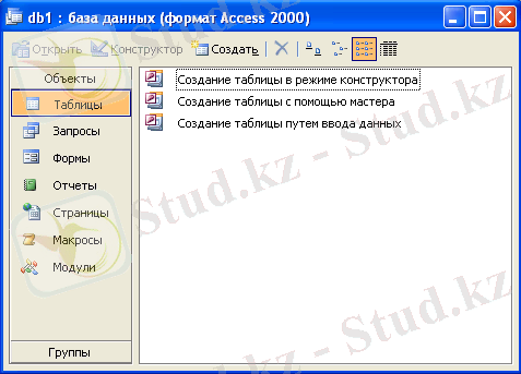 басқа үш бұйрықтық кнопкалар бар: Ашу, Конструктор, Құру . Олардың көмегімен кесте жұмысының режимі таңдалады.